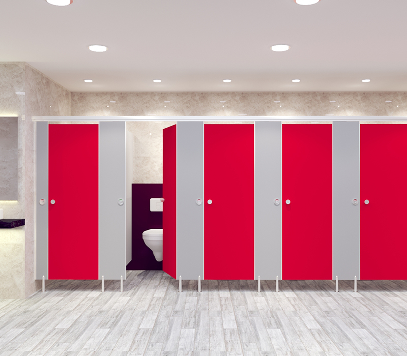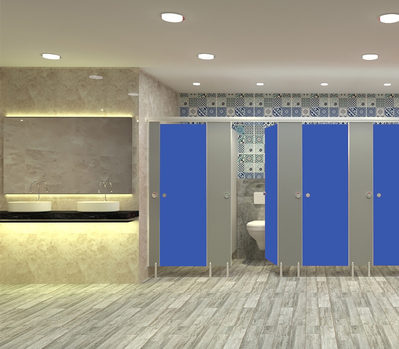 The adjustable foot that supports the pilasters is made from stainless steel (Grade 304) and its base is anchored to the floor with nylon plug, fixed into ground with stainless steel screws. There is a ground clearance of 150 mm. Stainless Steel 304 U-channels are used to attach with the divider panels to the wall as well as the mid panel with stainless steel (Grade 304) screw inserts. Stainless Steel top rail coated in stainless steel colour is used to fix the pilasters at the top. Doors are incorporated with the noise deafening tape to reduce the noise effect. All other fittings like hinges, coat hook, adjustable foot and lock set/latch indicator is manufactured in stainless steel.
